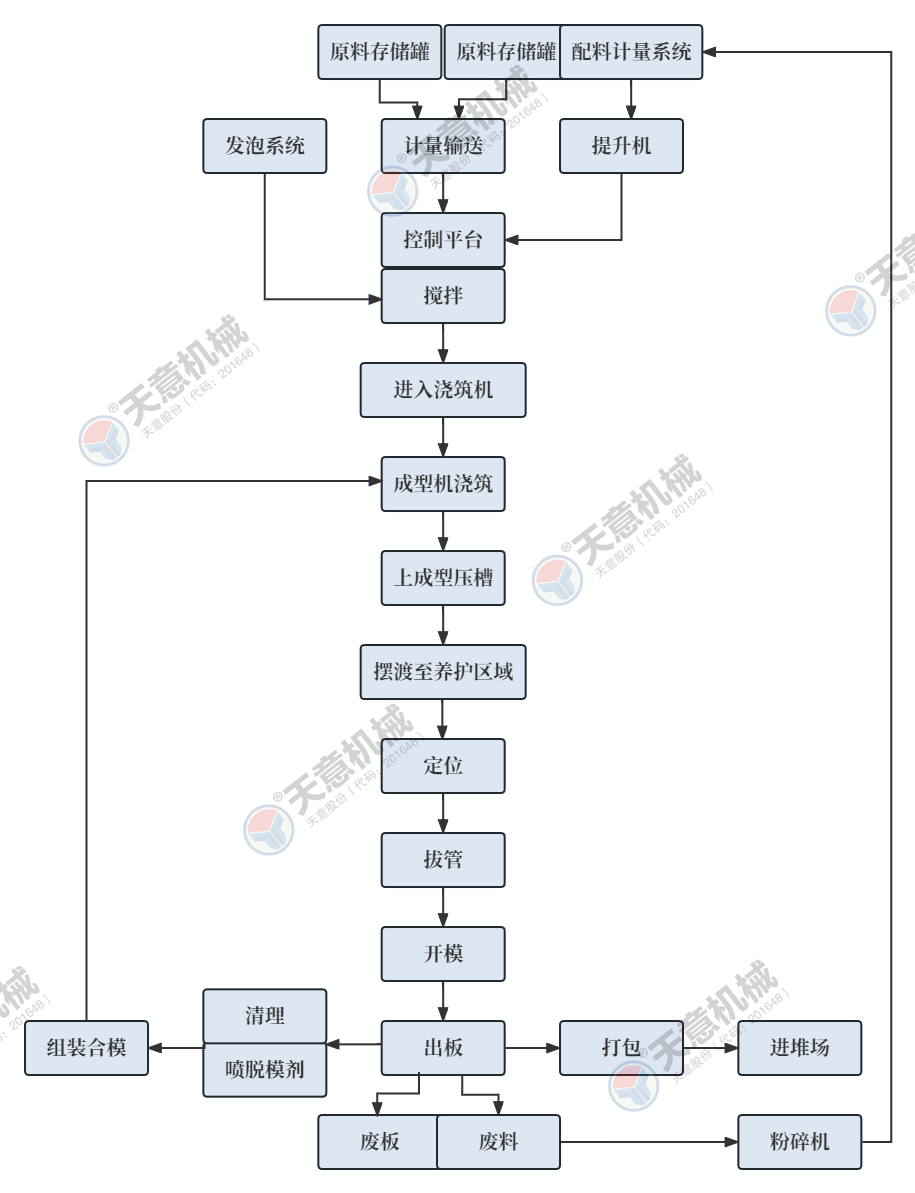 1.采用水泥發(fā)泡墻板專用5立方雙螺帶式高速攪拌機(jī),有效容積為3.5立方,攪拌均勻,攪拌速度快(發(fā)泡完成后60秒內(nèi)可將泡沫和料漿攪拌均勻),整體攪拌周期6-8分鐘/次,單次攪拌可澆筑一臺20塊墻板機(jī),雙寬螺帶式設(shè)計(jì),可有效的降低泡沫破損率.