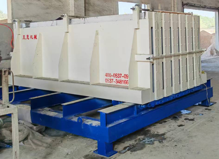 工作原理:模具的開合由下方的液壓機構(gòu)完成,和墻板機類似。合模后的鎖緊由上方和兩端的拉桿裝置實現(xiàn)。下方的強制同步裝置保證了大板在開合時的兩側(cè)同步。大板下方的輪組保證了大板在開合時不傾斜、不倒伏。