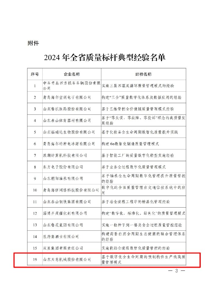 近日,山東省工業(yè)和信息化廳公布了全省質(zhì)量標(biāo)桿獎(jiǎng)。天意機(jī)械憑借在關(guān)鍵過(guò)程質(zhì)量控制方向的不懈探索,以基于數(shù)字化全生命周期的預(yù)制構(gòu)件生產(chǎn)線高質(zhì)量管理模式斬獲“2024年全省質(zhì)量標(biāo)桿”。